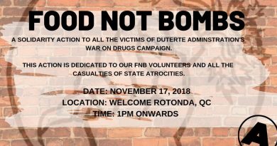 “Actually the reason why I declared myself to be anarchist. Because come to think about it there is no need for me to say that I am anarchist… for me, it was a political necessity to declare myself to be anarchist. I call myself an anarchist so as to distinguish my politics from the dominant leftist ideology here, whose followers claim that theirs is the right and true path towards the revolution.” Umali explains.